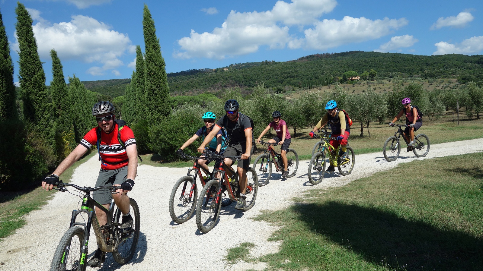Am Sonntagmorgen war es dann endlich soweit. Die erste Tour stand an. Nach der Gruppeneinteilung (Ferrari, Cinquecento, Cappuccino) wurden wir von unseren supercoolen Guides durch die einzigartige Landschaft der Toskana geführt. Die abwechslungsreiche Fahrt durch tolle Trails, Olivenbäume, Reben und märchenhafte Wälder war für alle ein gelungener Einstieg.