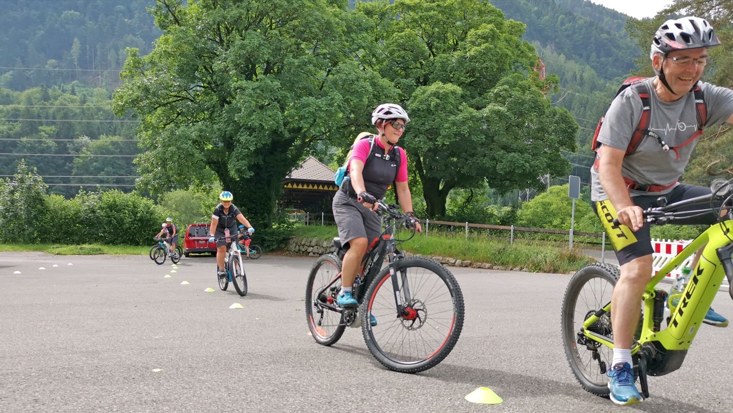Nach dem kräftigen Gewitter hat's über dem Bödeli erste Herbstnebelfelder - mitten im Sommer? Aha, das ist nur die hohe Luftfeuchtigkeit. Pünktlich zur abgemachten Zeit stehen sechs erwartungsfrohe BikerInnen bereit und sind gespannt, was sie erwartet. Und es geht gleich los: am Morgen üben wir auf einem Platz fleissig an der Grundtechnik: Slalom, Acht und Spurgasse, enge Kurven fahren, Absätze rauf, Absätze runter, bremsen, auf-/absteigen am Berg - das ganze Programm.Und immer wieder tönt's "vüre luege", "Finger uf d Heble". Bald wird klar: es gibt Menschen, die sind wohler zu Fuss unterwegs (Fuss-Menschen), andere wohler mit dem Bike (Redli-Menschen). Und beides ist richtig. Die Luftfeuchtigkeit beginnt mit der steigenden Temperatur zu kleben, das Zmittag gibt's dann unter zwei grossen Bäumen mit Bänken - Erholung.