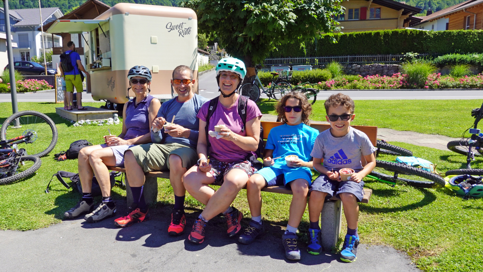 Papa hat für Mamma ein spezielles Geburtstags Geschenk organisiert. Während Mamma am Morgen bereits an einem Privat Kurs an der Fahrtechnik übte, stiess Papa mit den beiden Jungs erst am Mittag dazu um nach einem feinen zMittag eine Bike Tour auf dem "Bödeli" zu unternehmen.